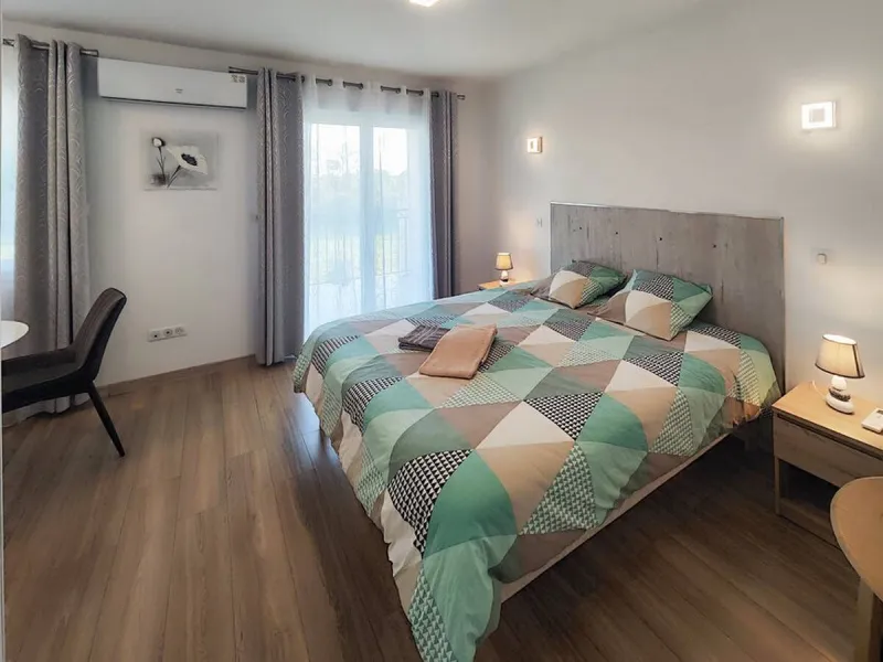 *1 chambre côté vignoble, 1 lit de 180x200, 1 salle d'eau WC+1 sèche serviette privatives et une loggia de 10m².