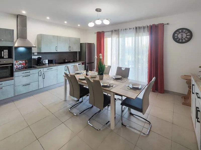 *une cuisine équipée, lave-vaisselle, micro-ondes, grille pain, plaque induction, bouilloire, cafetière, lave-linge