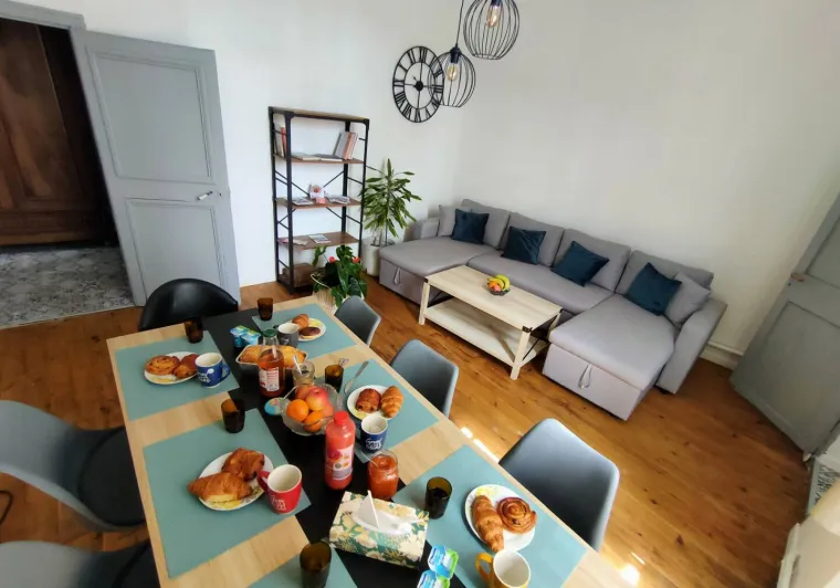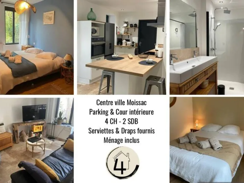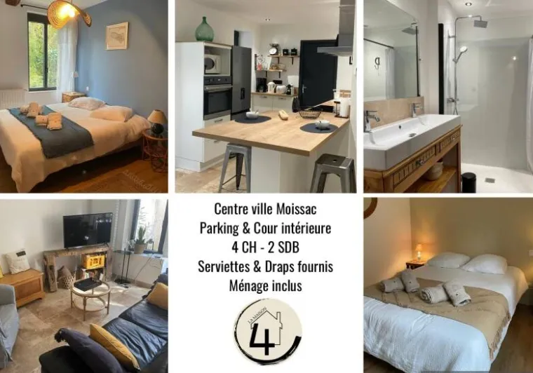 Cette maison constitue une escale parfaite pour les familles et les amis qui souhaitent découvrir Moissac. À seulement deux pas des commerces, du marché animé les samedis et dimanches, elle se trouve à 400 mètres du prestigieux patrimoine abbatial et à proximité du canal et des rives du Tarn. La gare est accessible à pied en 10 minutes.Le logement comprend : au rez-de-chaussée, une cuisine entièrement équipée (plaque à induction, fours, lave-vaisselle, îlot central), un séjour (table et 8 chaises), un salon TV (bureau, canapé, fauteuil, smart TV, Wifi), une salle d'eau avec douche, vasque et WC. A l'étage, un palier dessert 4 chambres (3 chambres avec 1 lit en 160 et 1 chambre avec 2 lits en 90), une salle d'eau avec double vasque, grande douche et WC. Un placard penderie se situe dans le couloir. Un garage au rez-de-chaussée avec lave-linge et baby-foot.