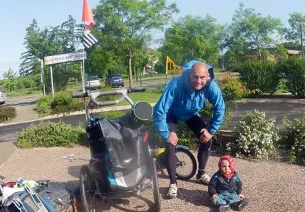 Les premiers coups de pédales nous mettent tout de suite dans le bain : il faut faire avancer un convoi avec maman qui tire la remorque de matériel bien chargée et papa qui tracte la carriole avec Yulian.