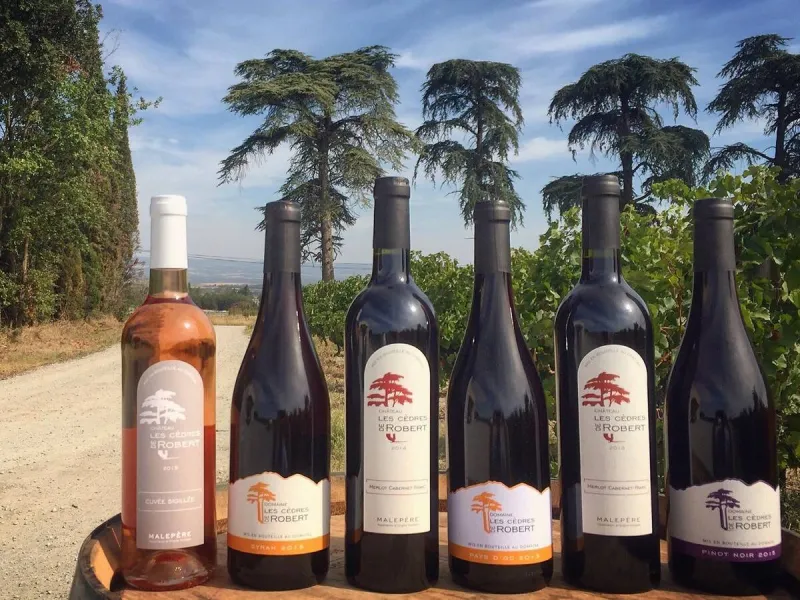 Domaine viticole, marqué Pays Cathare : 20 hectares de vignes, labellisé en Agriculture Biologique depuis 2021. 9 cépages entrant l'appellation Malepère AOP et l'IGP Pays d'Oc y sont cultivés. Les sols légers, les racines profondes, le terroir venté et bien exposé donnent des vins charpentés et fruités.Ancien domaine ayant appartenu à l'abbaye dominicaine toute proche de Prouilhe, le Castel de Robert est devenu les Cèdres de Robert en 2013 : l'accueil est situé au bout d'une belle allée de cèdres, en prise directe sur la Voie Verte qui passe à Villesiscle.