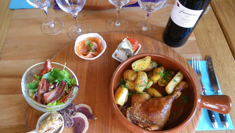 L' Auberge est située sur le canal des 2 mers et la voie verte qui relie Bordeaux à Sète. La terrasse couverte au bord du canal accueille les clients pour les petits déjeuners, les repas du midi et les tables d'hôtes du soir. La restauration du midi est conçue pour satisfaire les cyclo- touristes et les locaux avec une cuisine simple mais originale à base de produits frais et locaux de belle qualité.